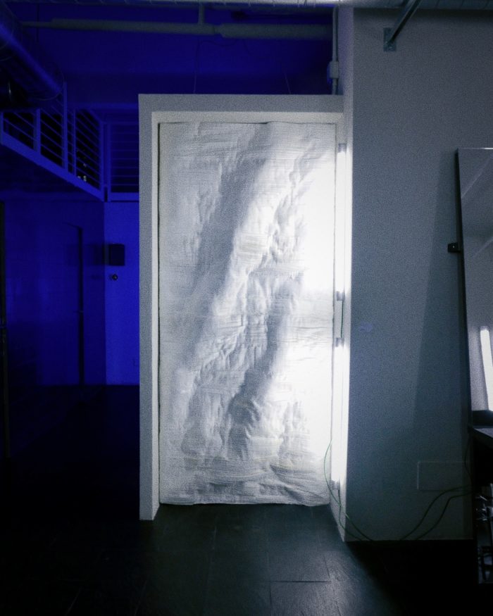 Il progetto trasla competenze tecniche e sensibilità materica in una dimensione spaziale. La parete è rivestita con un rasatello di cotone bianco recuperato da magazzini deadstock, poi plissettato a mano. La texture delle pieghe, volutamente irregolare, genera una superficie dinamica e tridimensionale, in cui la tensione tra uniformità cromatica e movimento crea un dialogo vivo con lo spazio. In questa visione, la materialità non si esaurisce nei materiali, ma riguarda la qualità delle relazioni tra forma, luce, spazio e tattilità. La superficie si comporta come una pelle: un elemento che non si limita a coprire, ma trasmette, media e mette in relazione.